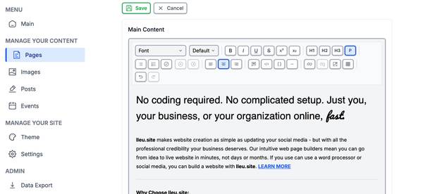 Your customers want to find your hours, contact info, menu, or products — quickly and easily. With lleu.site, you can have a professional website in minutes, without learning complicated design tools or paying for expensive hosting.